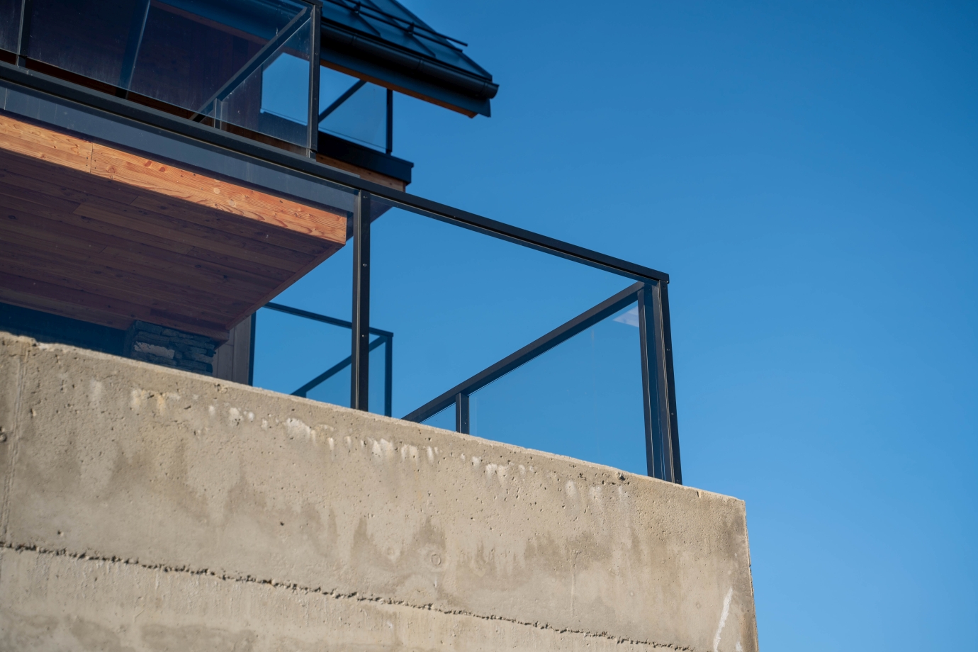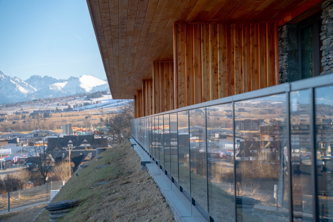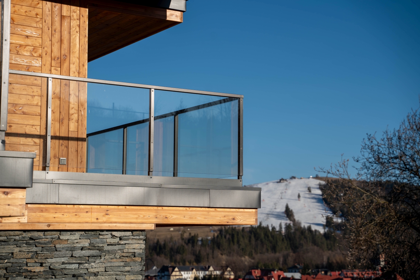 Balustrady szklane zewnętrzne łączą szkło z elementami stali malowanej proszkowo, subtelnie równoważąc regionalny charakter architektury lekką, nowoczesną formą. Transparentne wypełnienie pozwala zachować rytm elewacji i spójność wizualną bryły.
