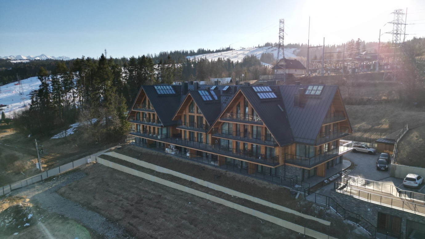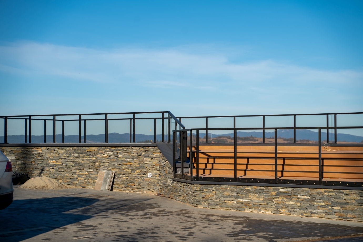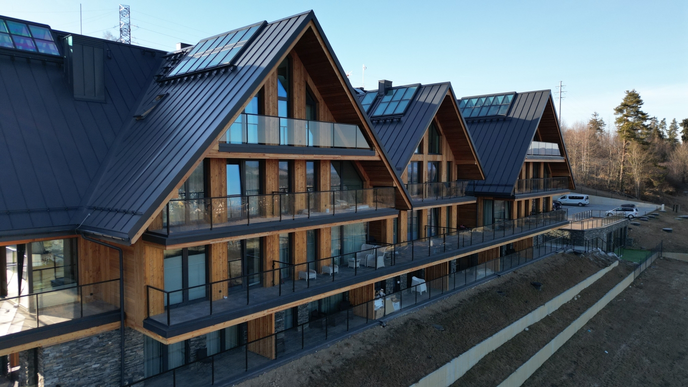 Balustrady szklane zewnętrzne łączą szkło z elementami stali malowanej proszkowo, subtelnie równoważąc regionalny charakter architektury lekką, nowoczesną formą. Transparentne wypełnienie pozwala zachować rytm elewacji i spójność wizualną bryły.