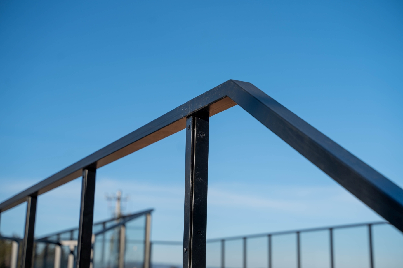 Zewnętrzne barierki stalowe chronią ciągi komunikacyjne i tarasy, łącząc trwałość z estetyką dopasowaną do architektury obiektu.