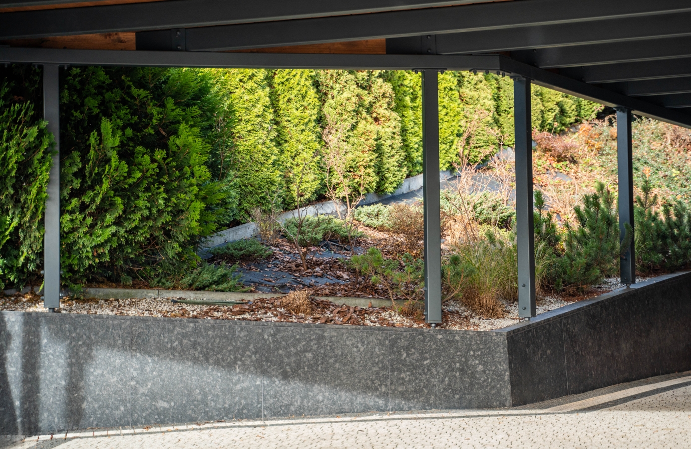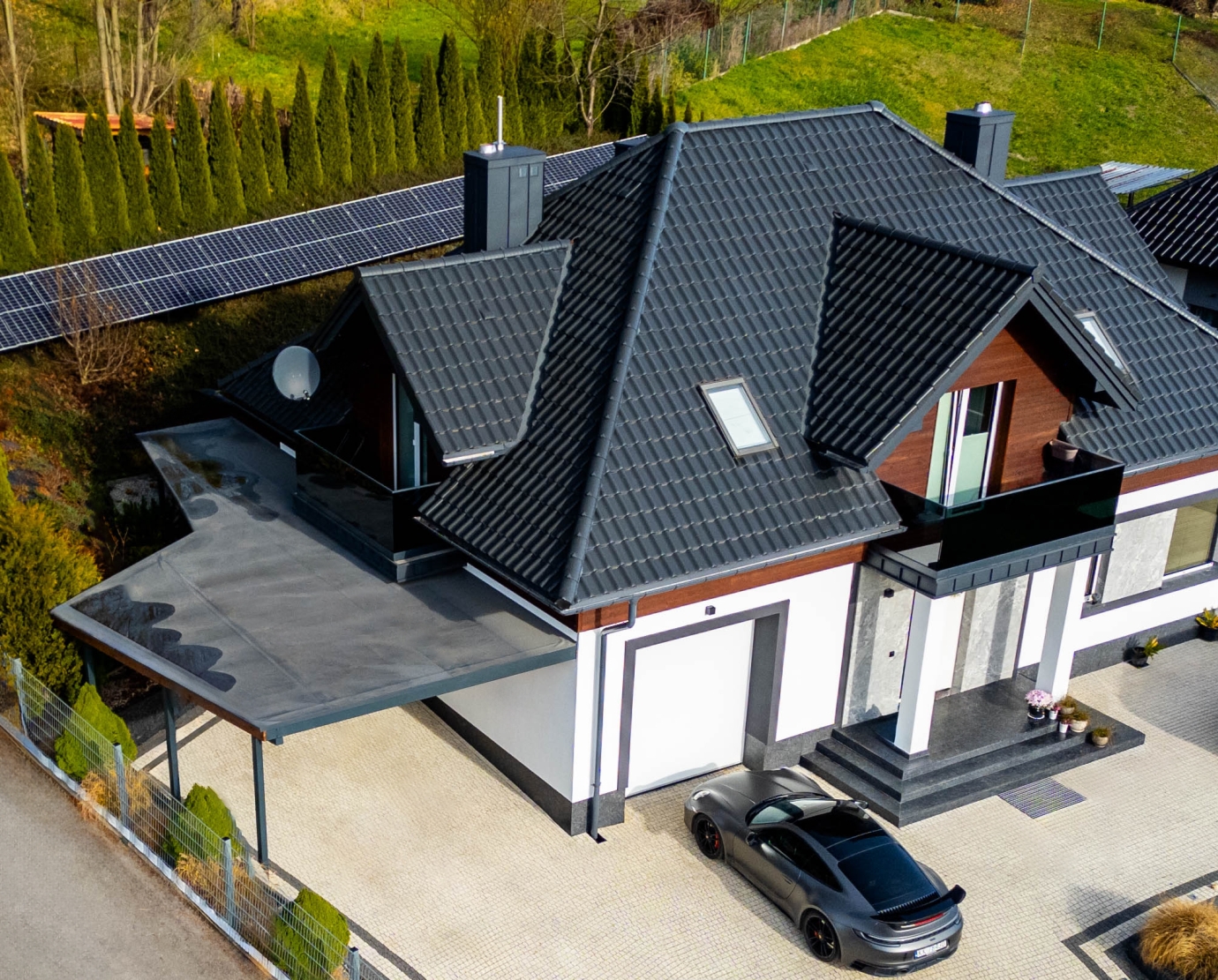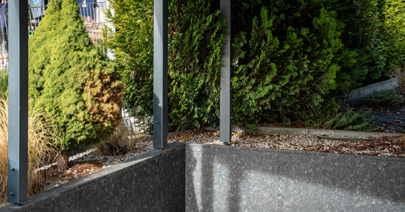 Konstrukcja stalowa zaprojektowana indywidualnie z myślą o stromym i nieregularnym terenie. Precyzyjne dopasowanie do ukształtowania działki.