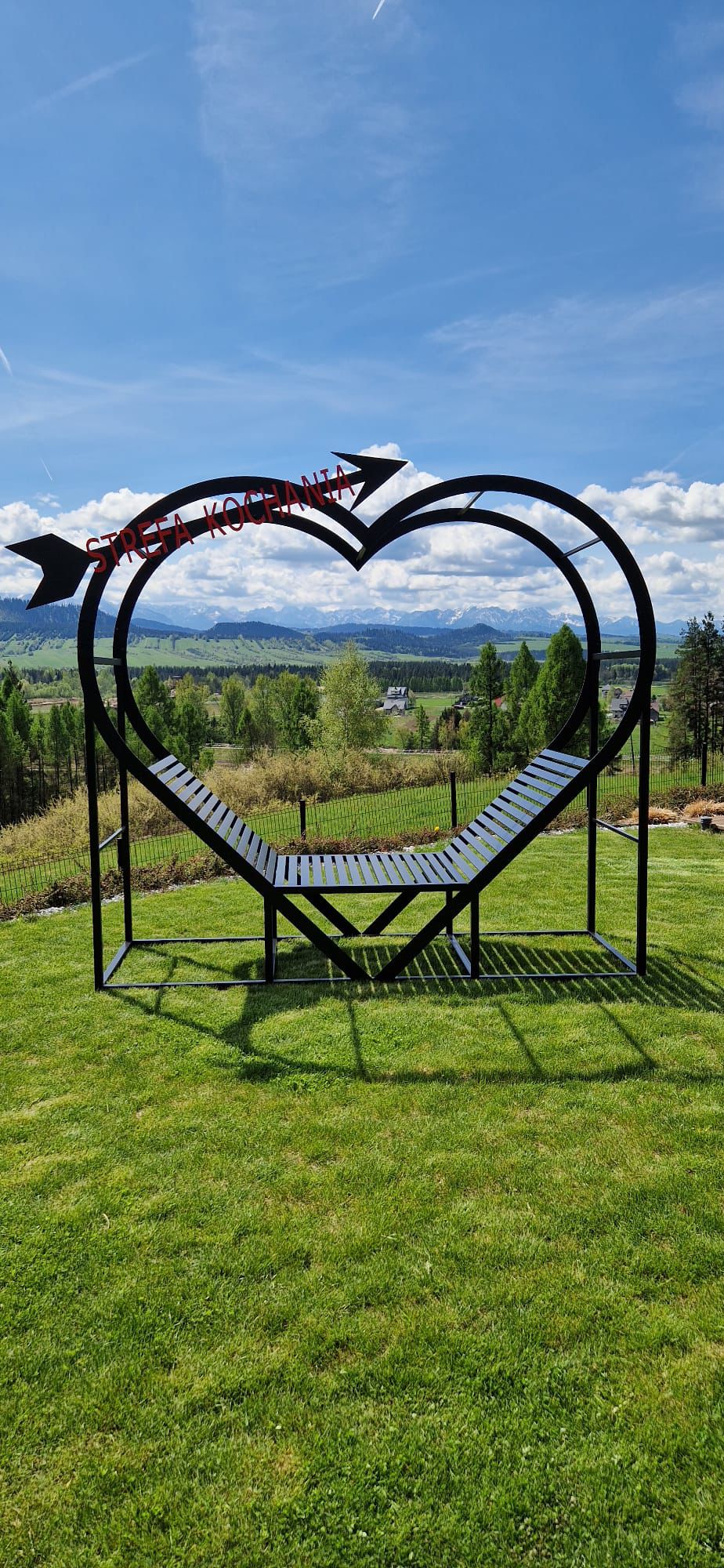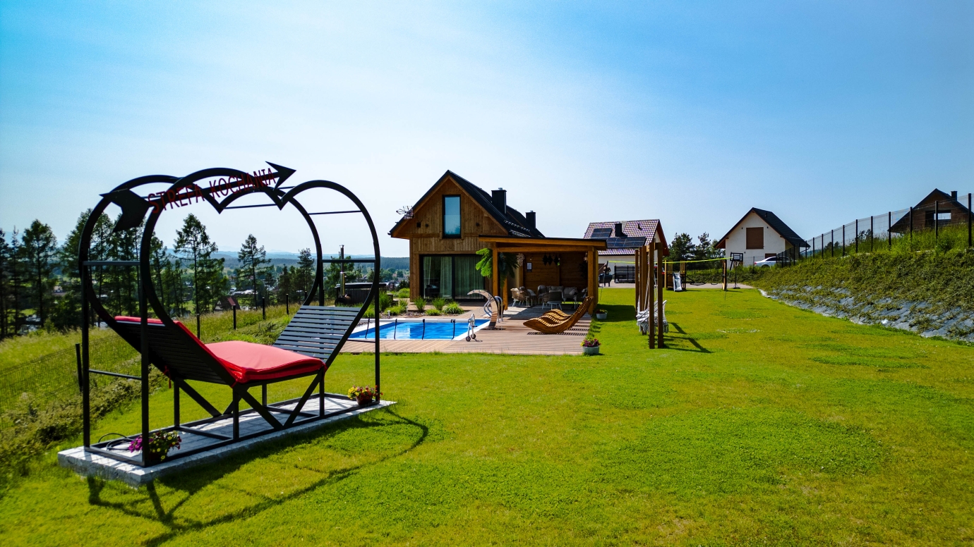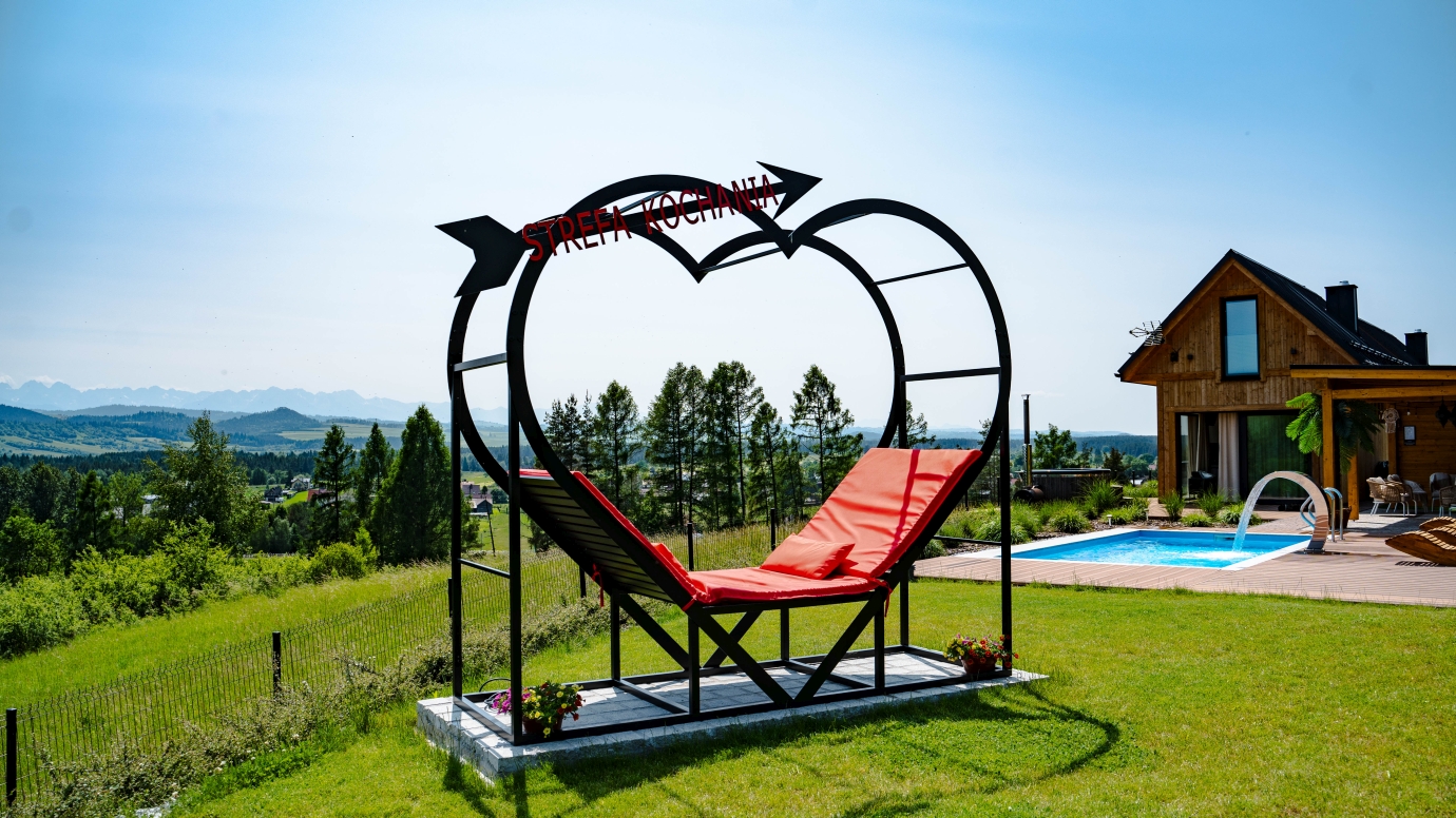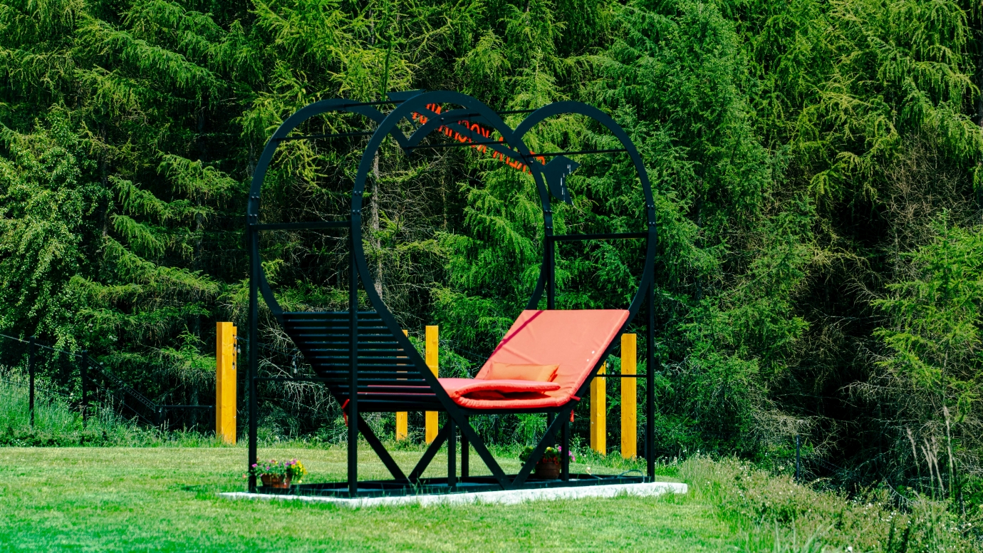 Centralnym elementem realizacji jest „Strefa Kochania” – designerska leżanka o charakterystycznej formie serca. To nie tylko mebel ogrodowy, ale symboliczny punkt przestrzeni zaprojektowany do odpoczynku i zatrzymania chwili. Solidna stalowa konstrukcja, zabezpieczona antykorozyjnie i malowana proszkowo, gwarantuje trwałość i komfort użytkowania.